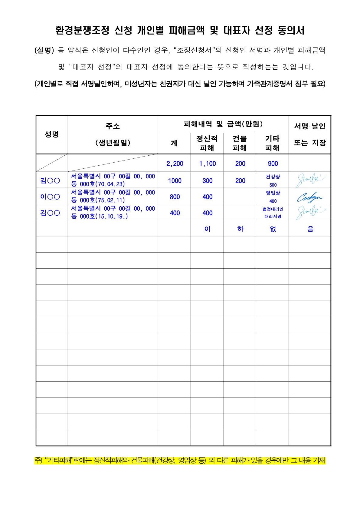 주) 선정 대표자는 신청인이 다수인인 경우에 1명~3명 범위 내에서 선정 할 수 있으며, 별첨1의 대표자선정 동의서를