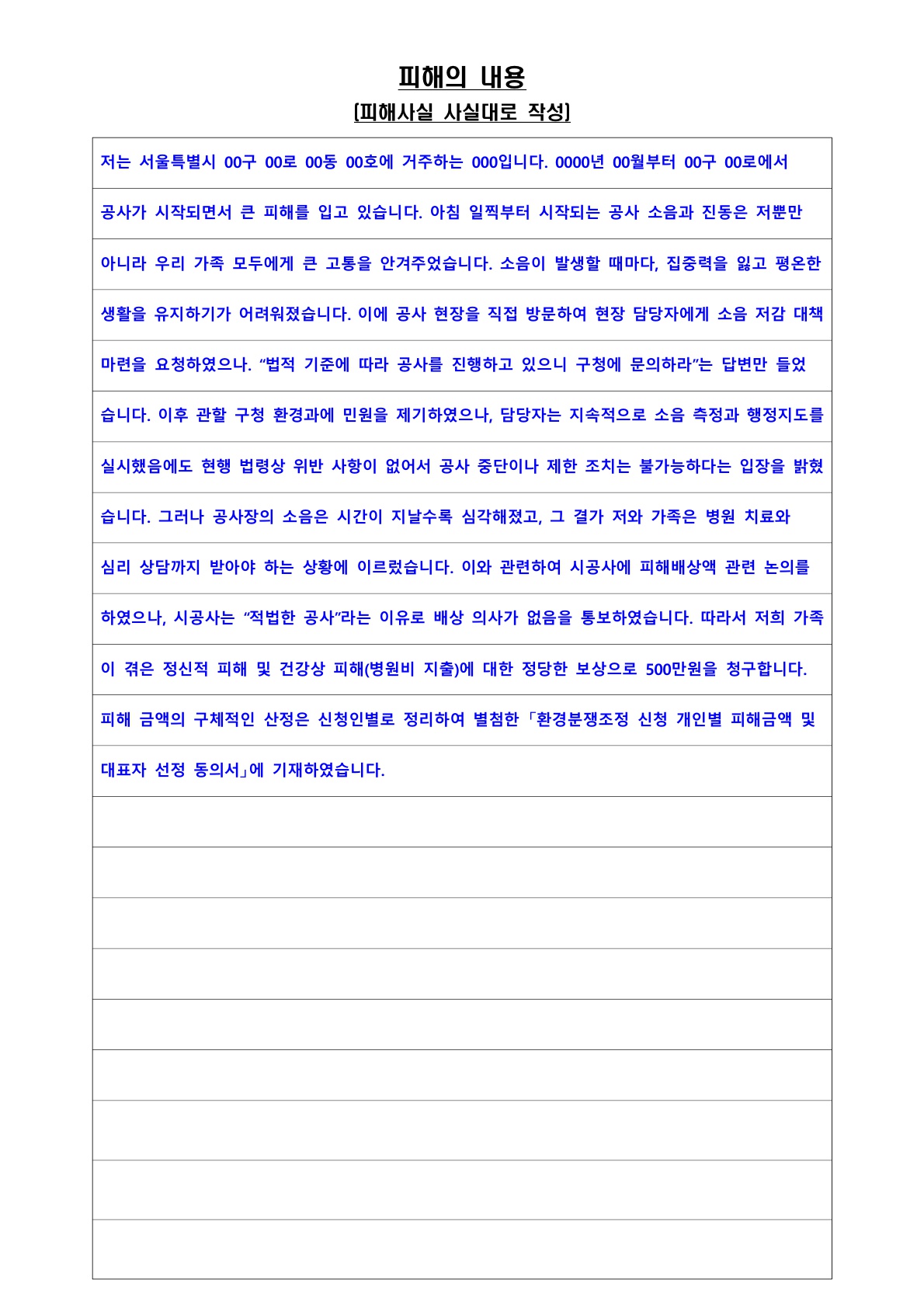 주) '물질적피해' 란에는 정신적피해외 건물피해 등 다른 피해가 있을 경우에만 그 내용 기재